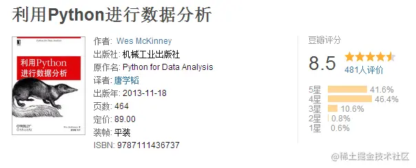 上面第1步已经打好了Python编程的基础,现在进入数据分析的学习阶段。推荐一本书《利用Python进行数据分析》就够了,这本书在豆瓣评分是8.5分。
