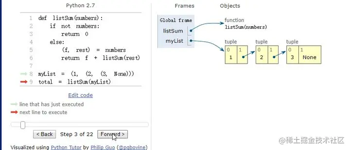 如果你不知道代码在内存中是如何运行的,不妨把它拷贝到Tutor里可视化执行一遍,加深理解。