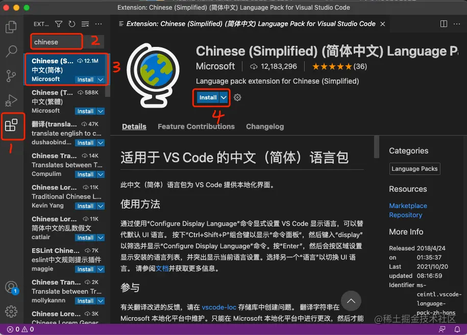 1、打开Vscode,如下图所示点击 Extensions 按钮[1],在扩展搜索框[2]中输入chinese,选择第一个扩展Chinese (Simplified) Language Pack for Visual Studio Code 点击install[4]即可