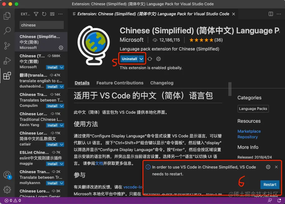 要想恢复英文环境,只需要卸载上面安装的中文扩展即可。