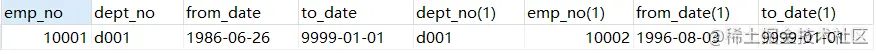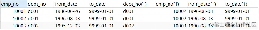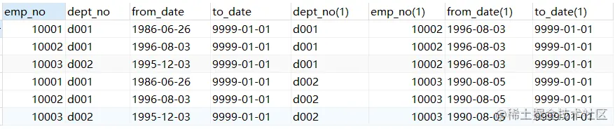 e.dept_no = m.dept_no, 在这些记录中寻找部门号相同的员工。得到如下结果。
