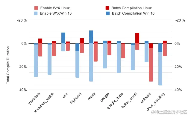 批量编译可以减少总的编译时间 (Ignition + Sparkplug) 高达44% ,而无需回溯 JavaScript 的执行。如果我们只看编译 Sparkplug 代码的成本,影响显然更大,例如 Win 10上的 docs_scrolling 基准 (见下文) 减少了82% 。令人惊讶的是,批处理编译比 W^X 的成本提高了更多的编译性能,因为将类似的操作批处理在一起对 CPU 来说更好。在下图中,你可以看到 W^X 对编译时间的影响 (Ignition + Sparkplug)) ,以及批量编译如何减轻这种开销。