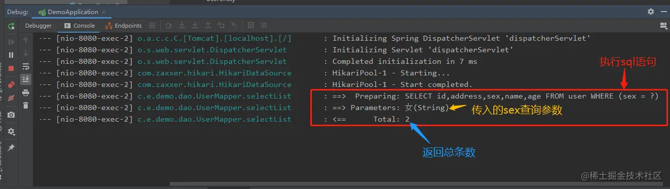 我们来确认一下,回到idea控制台,请看下边,朋友们,sql语句已经告诉了我们一切,很显然,是把sex = '男' 作为了where 条件 进行了数据过滤!