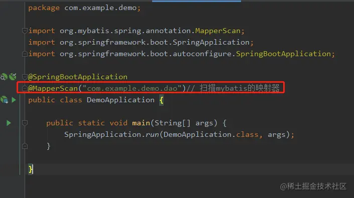 那你请在启动类 DemoApplication 中添加如下这行,表示指定扫描 dao。