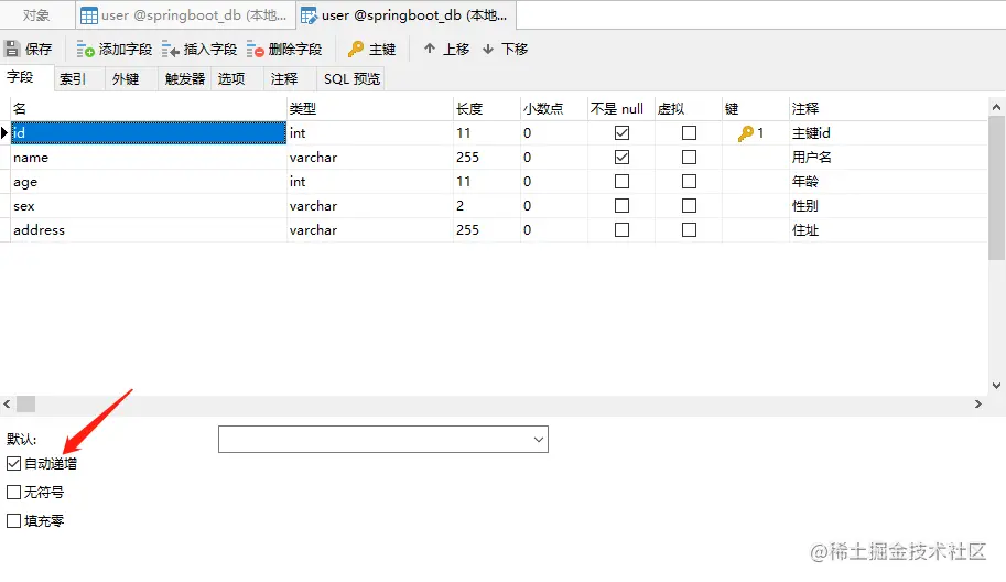 public Integer getId() { return id; } public void setId(Integer id) { this.id = id; } public String getName() { return name; } public void setName(String name) { this.name = name; } public Integer getAge() { return age; } public void setAge(Integer age) { this.age = age; } public String getSex() { return sex; } public void setSex(String sex) { this.sex = sex; } public String getAddress() { return address; } public void setAddress(String address) { this.address = address; } }