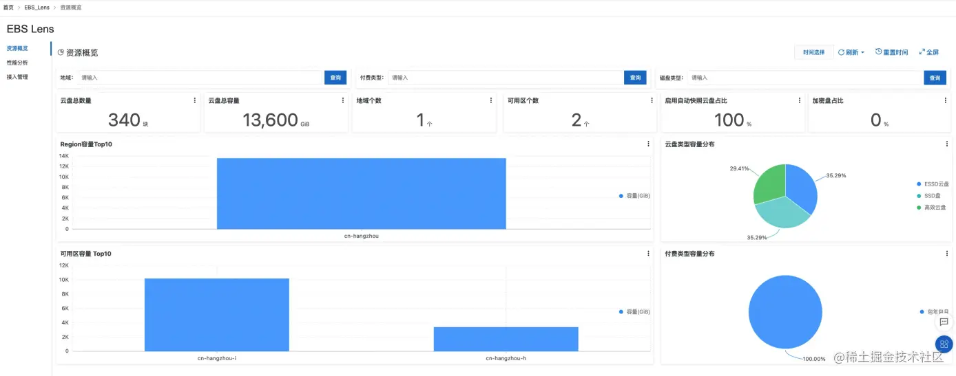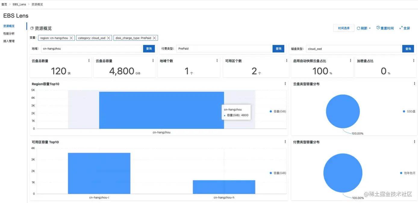 EBS云盘资产同步、日志采集开启之后,EBS Lens就有了EBS云盘资产和云盘的监控数据了,基于这两个数据,EBS Lens做了两个监控大盘,资源概览和性能分析页面。