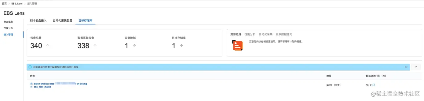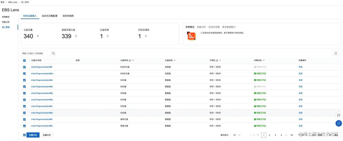 EBS Lens开启后,SLS会自动从用户的EBS资产中拉取云盘列表。进入APP后首先展示的就是接入管理页面,在这个页面,可以看到EBS云盘全局的一个管理视图,包含以下信息: