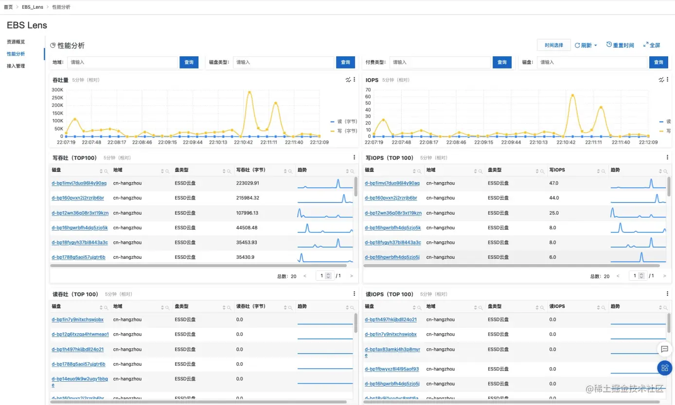 性能分析页面还支持对地域、付费类型、云盘类型、云盘id进行筛选,满足用户精细化监控的需求