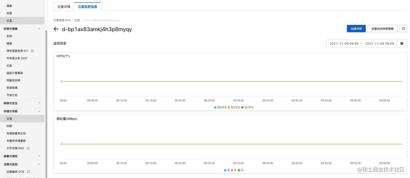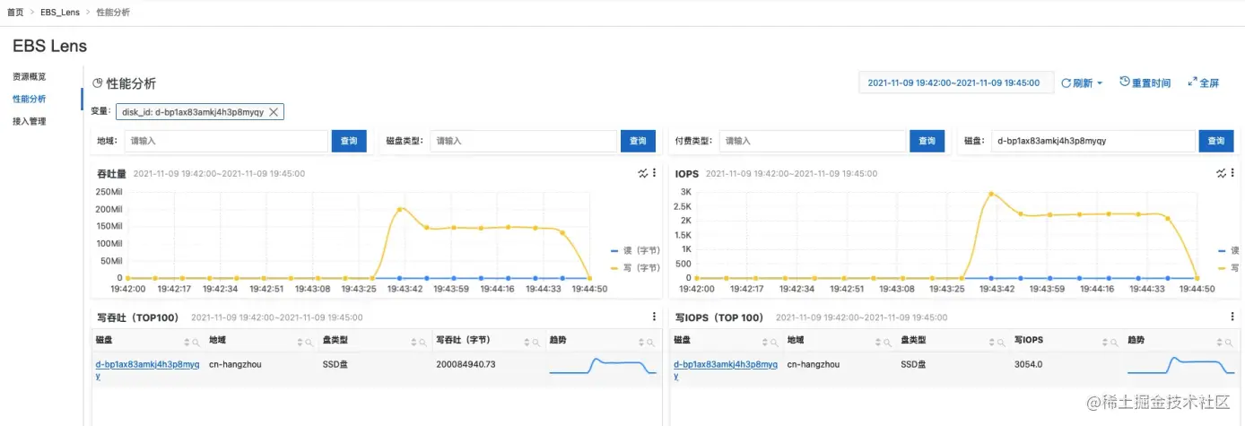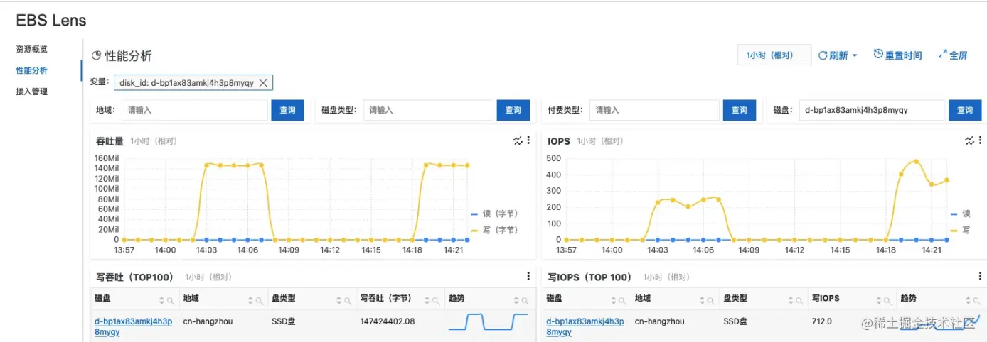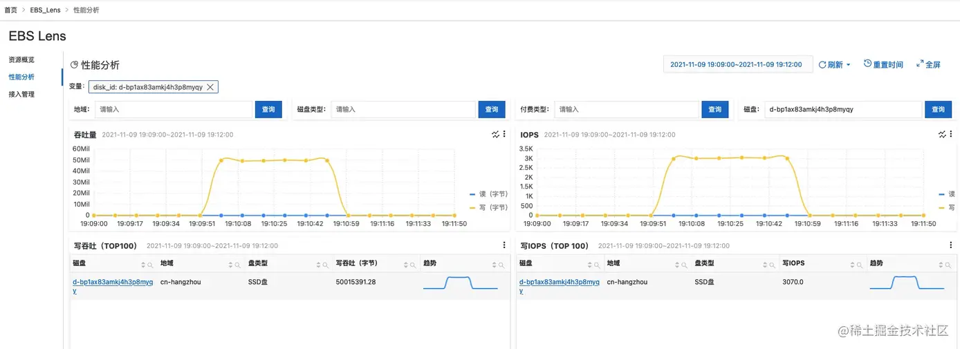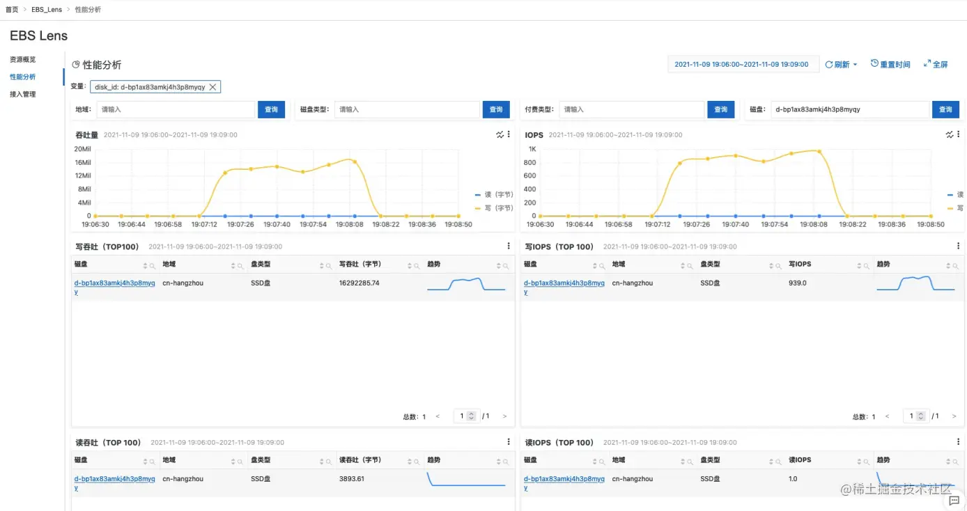- 打开性能分析页面,确认云盘监控数据已接入进来
