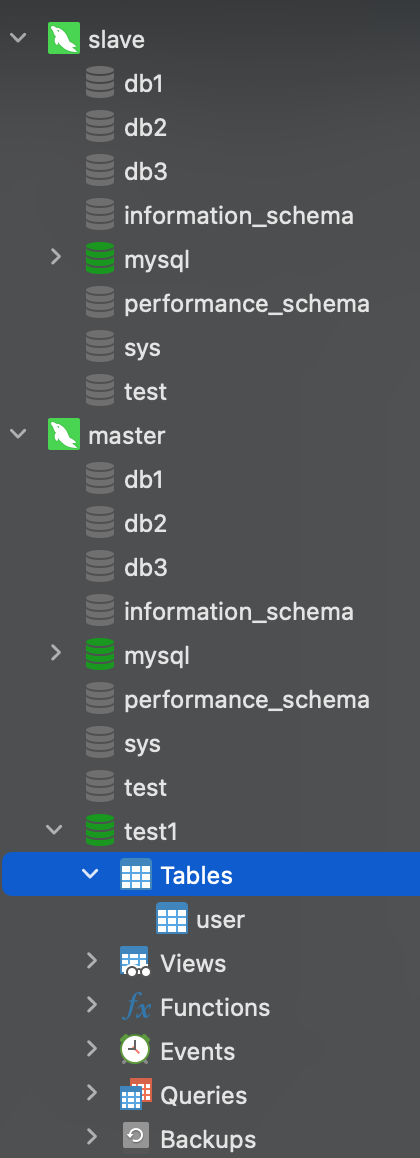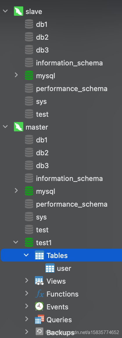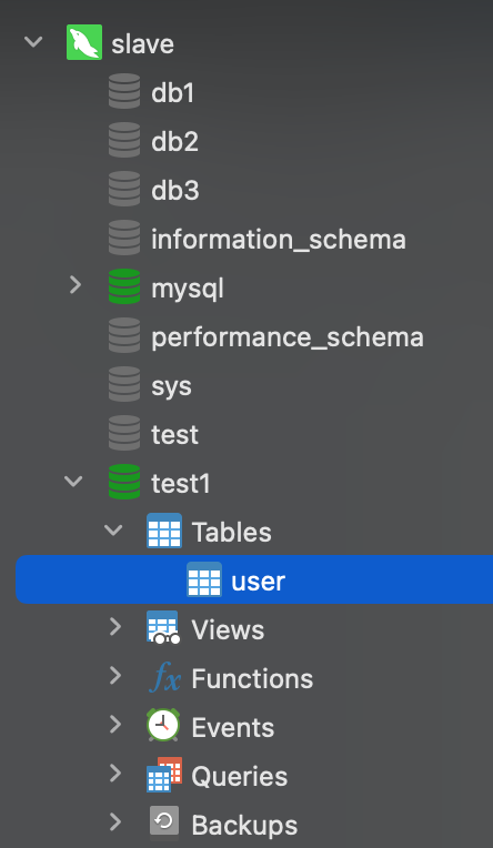 稍等片刻即可看到 从库也出来新的数据库 test1 同时出来了 和主库上一摸一样的表 user