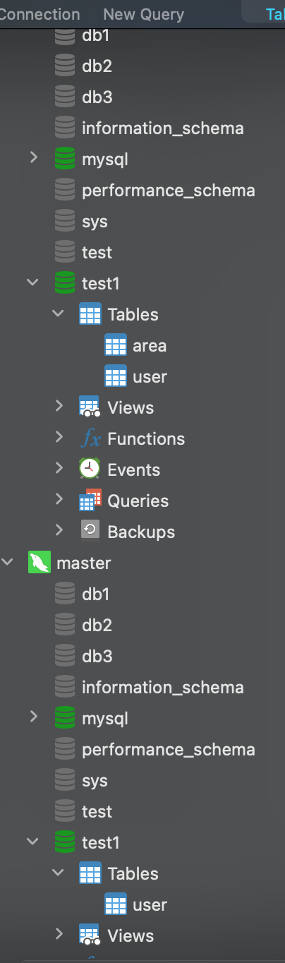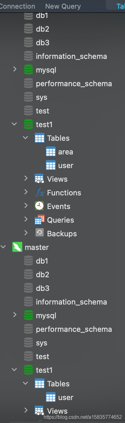 在主库上新建test1数据库 同时新建表 user user表字段随意 ,在从库上建area表,发现主库上没有area,由此可以发现主从模式搭建完成。