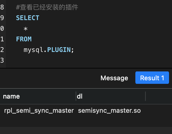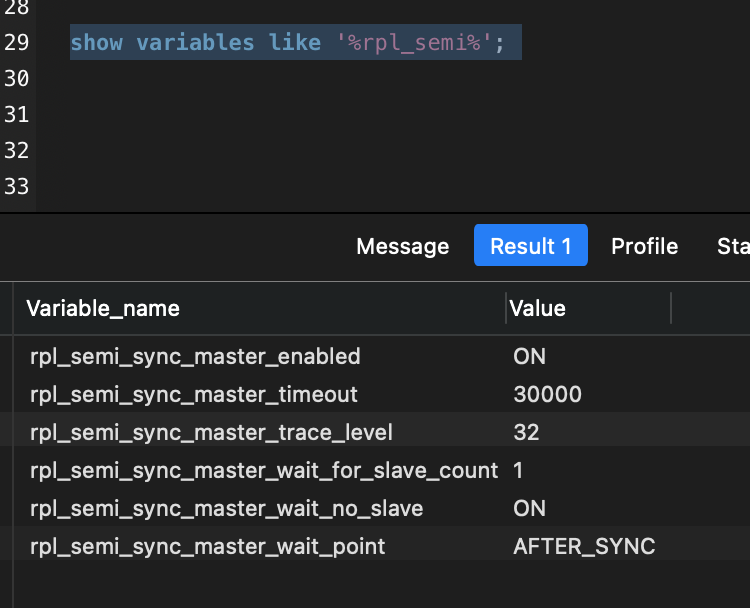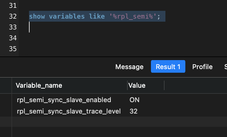 进行查看配置的值 执行 show variables like '%rpl_semi%';