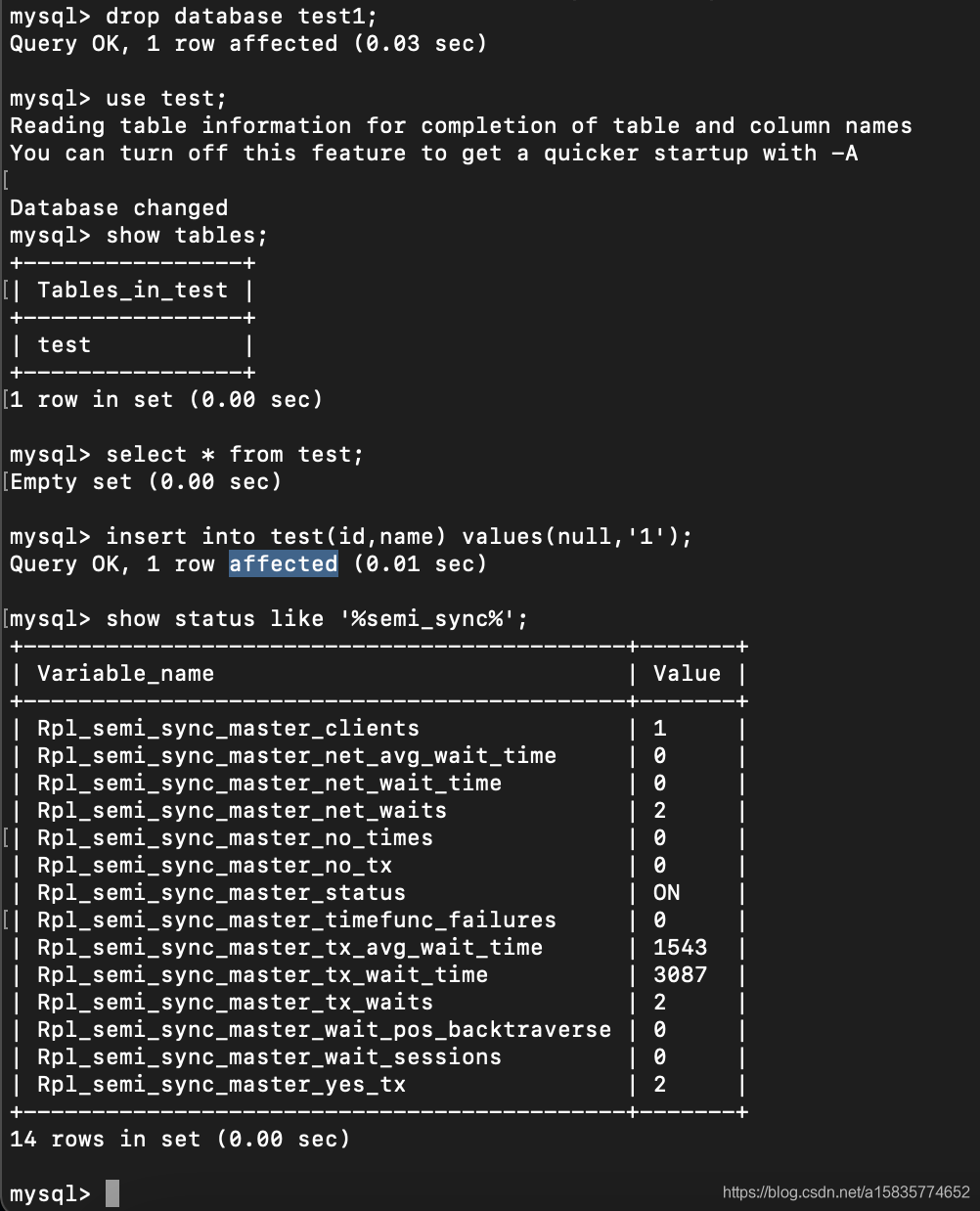 此时会发现Rpl_semi_sync_master_yes_tx值变为2,即刚才的drop database 和 insert事务通过半同步复制到从库上了