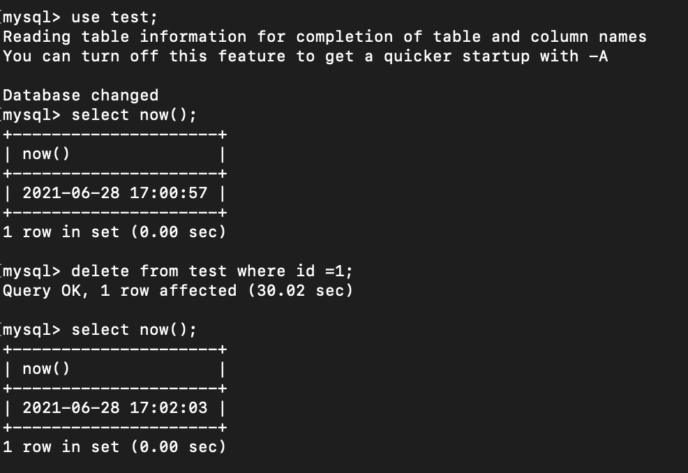 此时执行时间很快,说明网络异常的场景下,主库等待rpl_semi_sync_master_timeout毫秒超时后,自动转成异步复制的场景。