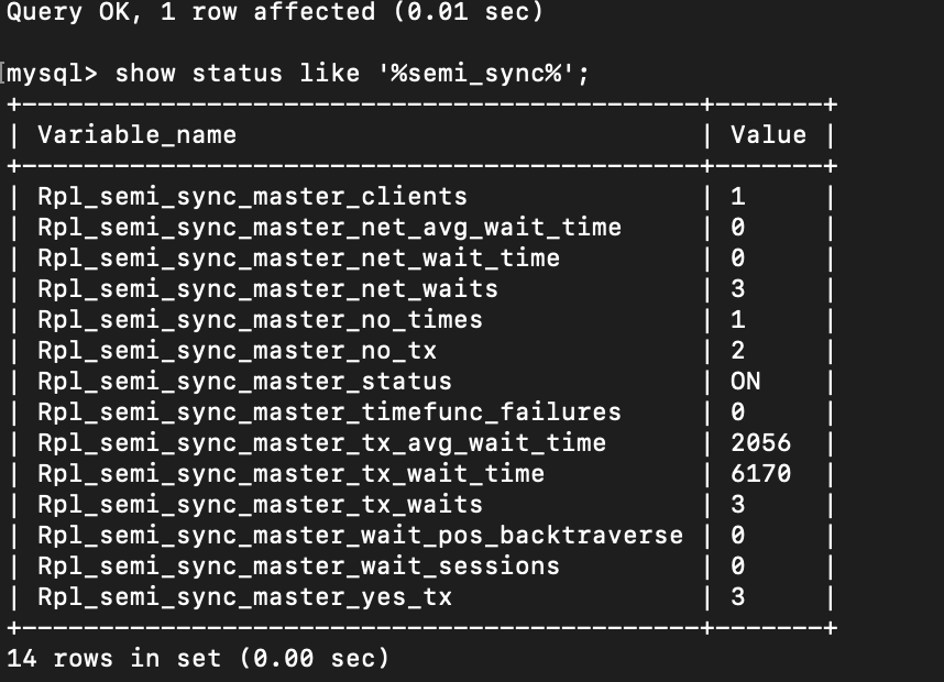 Rpl_semi_sync_master_yes_tx | 2 刚才并没有通过半同步复制完成,所以半同步并没有累加