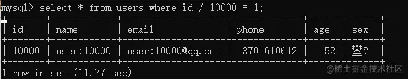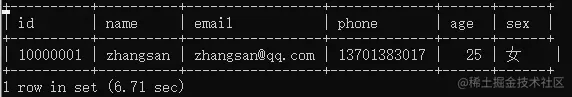 当我们换一种方法来查找这一条数据时,比如使用id来查询,由于id默认为主键索引,所以查询速度较快: