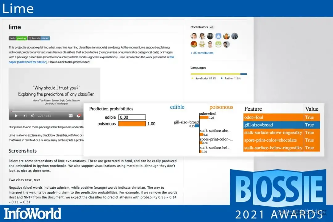 Lime(local interpretable model-agnostic explanations 的简称)是一种 post-hoc 技术,通过扰动输入的特征并检查预测结果来解释任何机器学习分类器的预测。Lime 能够解释任何具有两个或更多类的黑盒分类器,其同时适用于文本和图像领域。Lime 也被包含在 InterpretML 中。