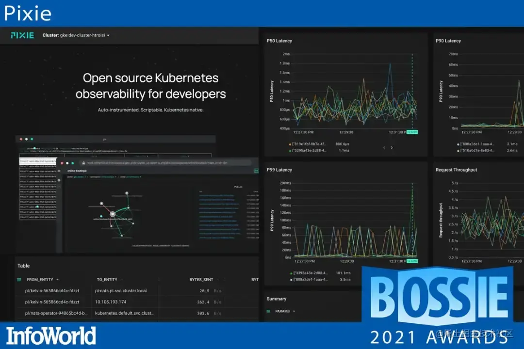 Pixie 是 Kubernetes 应用的可观察性工具,它可以查看集群的高级状态,如服务地图、集群资源和应用流量;还可以深入到更详细的视图,如 pod 状态、火焰图和单个 full-body 应用请求。Pixie 使用 eBPF 自动收集遥测数据,它在集群本地收集、存储和查询所有的遥测数据,使用不到 5% 的集群 CPU。Pixie的用例包括集群内的网络监控、基础设施健康、服务性能和数据库查询剖析。