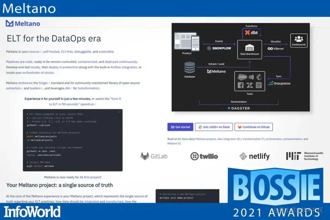 Meltano 是今年从 GitLab 中分离出来的,一个免费的开源 DataOps 替代传统 ELT(提取、加载、转换)的工具链。Meltano 的数据仓库框架使得为你的项目建模、提取和转换数据变得容易,并通过内置的分析工具和简化报告的仪表盘来补充集成和转换管道。Meltano提供了一个可靠的提取器和加载器库,以及对 Singer 标准的 data extracting taps 和 data loading targets 的支持,Meltano 已经是一个数据编排的动力源。