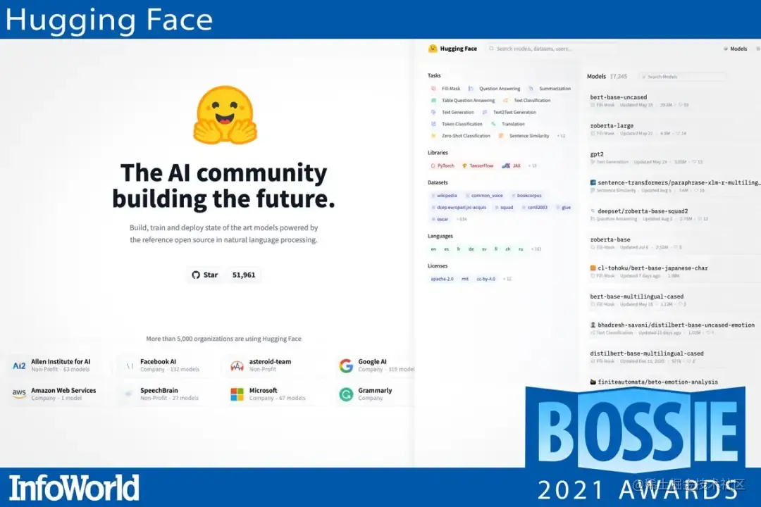 Hugging Face 提供了最重要的开源深度学习资源库,它本身并不是一个深度学习框架。Hugging Face 的目标是扩展到文本之外,支持图像、音频、视频、物体检测等。Infoworld 指出,深度学习从业者应在未来几年内密切关注这个 repo。