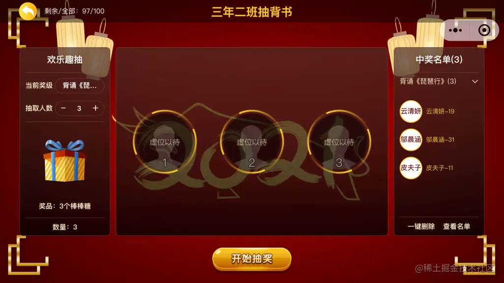 小程序中的抽奖界面使用了横屏模式,可以进入小程序体验一下,具体操作可参考《如何制作一个抽奖点名工具》。