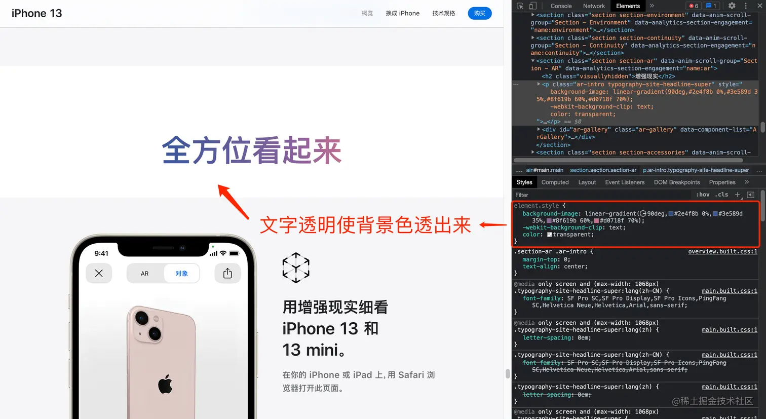 background-image: linear-gradient(...);——整个.section-headline背景渐变background-clip: text;——按文字区域裁剪背景(整个矩形只剩下文字的区域了)color: transparent;——文字透明(把背景颜色透出来)