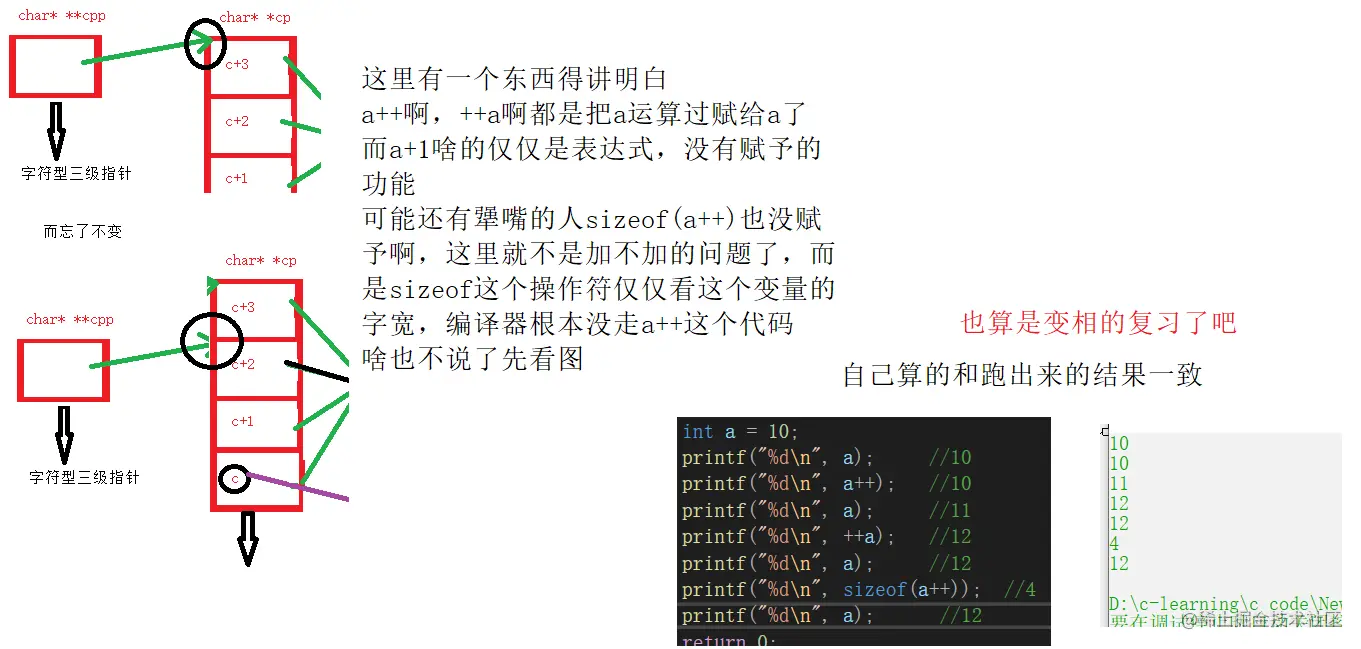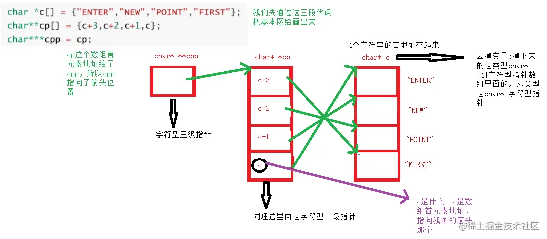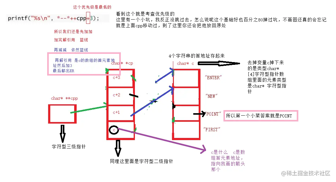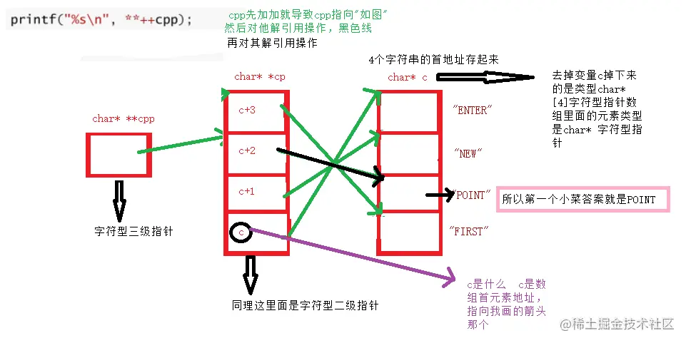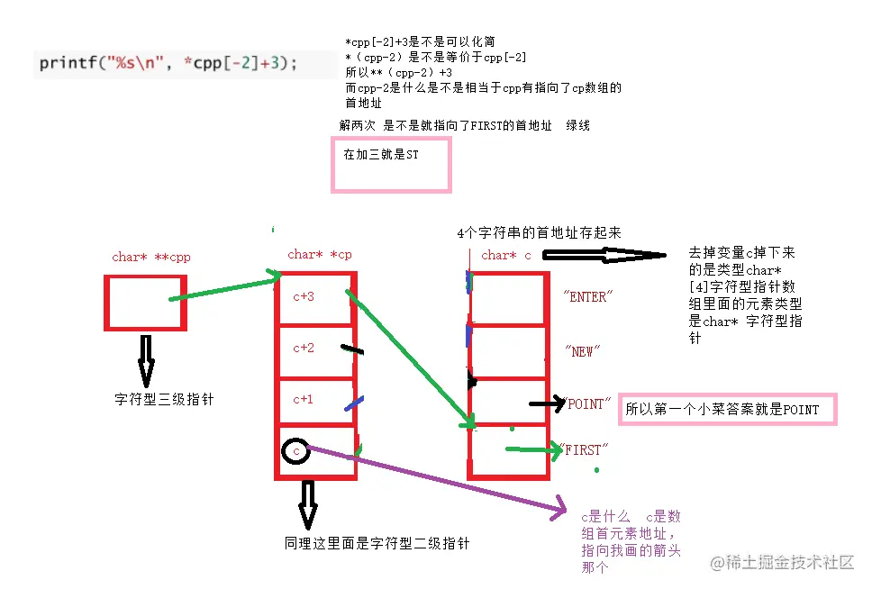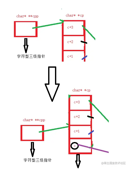 这里就有一个坑了,可能对不画图的朋友来说不是坑,但是一旦画图了,心中没留印象的话,那就是图在哪心在哪的错误了 首先上面那个并没有cpp的赋予操作,只有仅仅的cpp-2,所以cpp必须还要指到cp[2]的位置