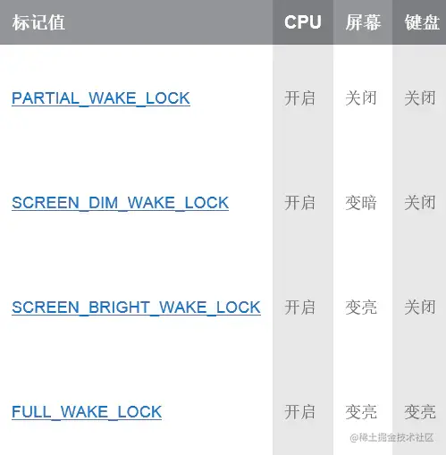 其中,唤醒锁有下面几种类型: