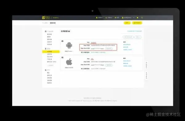 ► 为产品创建安卓和iOS应用在服务栏目下,点击“应用配置”,分别添加安卓与iOS应用。