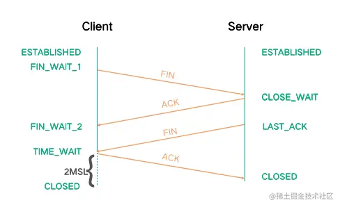 第四次挥手:Client 端收到 FIN 之后,一样发送一个 ACK 报文作为应答,且把服务端的序列号值 +1 作为自己 ACK 报文的序列号值,此时客户端处于 TIME_WAIT(时间等待) 状态。注意此时TCP连接还没有释放,必须经过2MSL(最长报文段寿命) 的时间后,才进CLOSED(关闭等待)状态。服务端收到 ACK 报文之后,就处于关闭连接了,处于 CLOSED 状态。