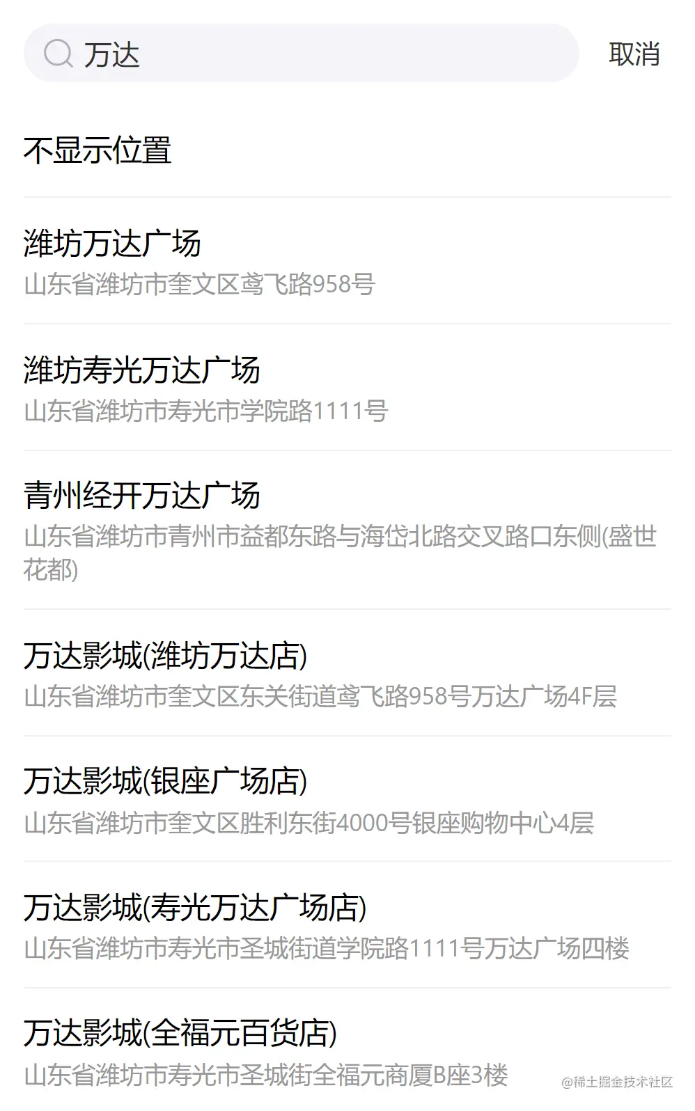 如果还想继续选择其他的地址,比如商场、门店等,就需要对附近的地名进行检索,比如下图
