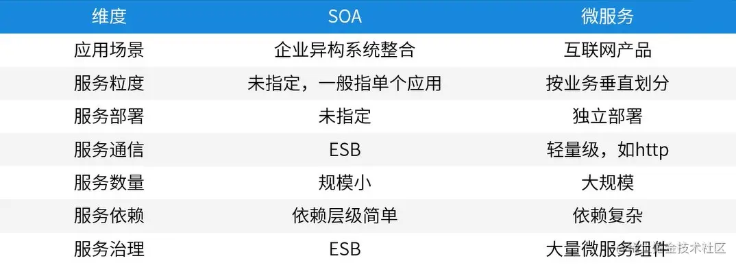 - 微服务是服务化的一种实现:SOA是一种架构思想,微服务是其一种实现方式,如:利用http 代替ESB
