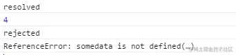 在resolve的回调中,我们console.log(somedata);而somedata这个变量是没有被定义的。如果我们不用Promise,代码运行到这里就直接在控制台报错了,不往下运行了。但是在这里,会得到这样的结果: