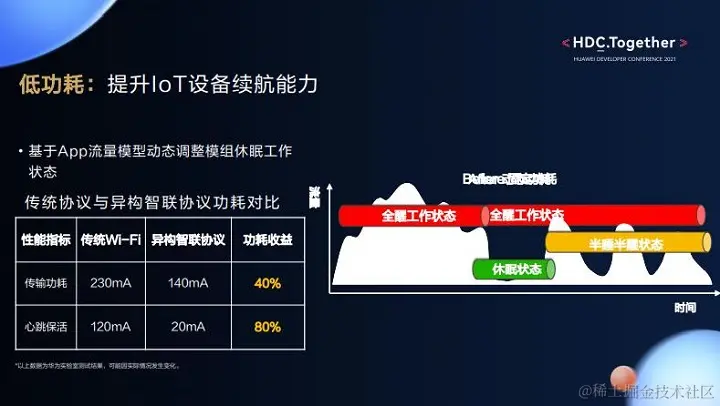 传统Wi-Fi P2P在工作时,一直是持续的、全景的,传输功耗大。异构智联协议会基于App流量模型动态调整模组工作状态,包括全醒工作状态、休眠状态和半睡半醒状态。效果上,异构智联协议比较传统Wi-Fi传输功耗降低40%,待机状态下降低80%。这对于IoT设备以及电池类的运动相机非常有帮助,避免拍摄3分钟传输半小时的情况出现。
