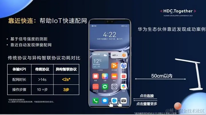 基于信号强度进行测距,手机设备靠近自动发现并弹窗配网。异构智联协议功耗相比传统协议的配网时长从大于14秒提升至小于2秒,操作步骤从10步以上变为3步即可完成,使用户体验更加流畅。