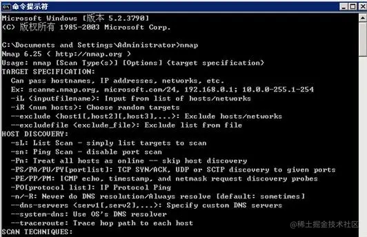 关闭图形界面的zenmap,打开cmd,在cmd下输入命令:nmap,nmap会返回使用说明。