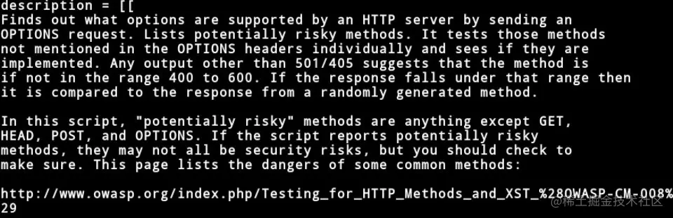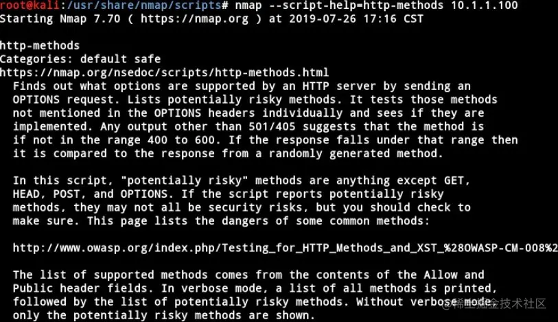 首先我们要知道脚本的用法,所以需要用到--script-help。如下所示--scritp-hep后面指定脚本名称即可map --script-help=http-methods 10.1.1.100