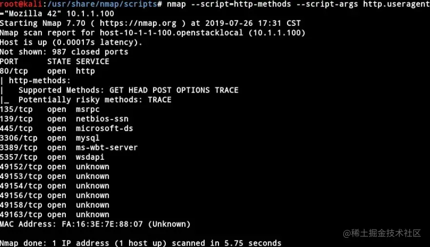 在使用脚本时,如果脚本支持,我们还可以通过--script-args传入参数,还是以http-method为例,我们知道一些网站会通过判断user-agent来判断请求是否合法,那nmap在请求时有没有带上自己的特征呢?