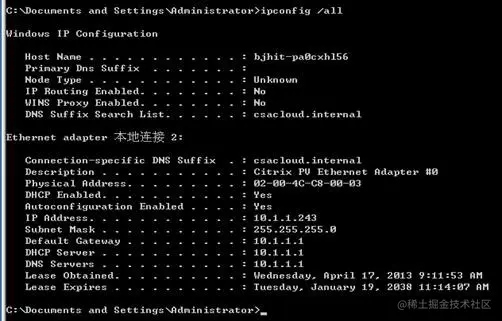 打开cmd控制台,在控制台中输入ipconfig /all,查看本机网关信息。从下图中可以看到,本机的IP地址为:10.1.1.243,网关地址为:10.1.1.1: