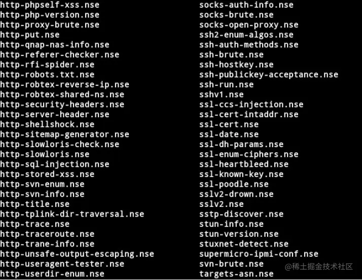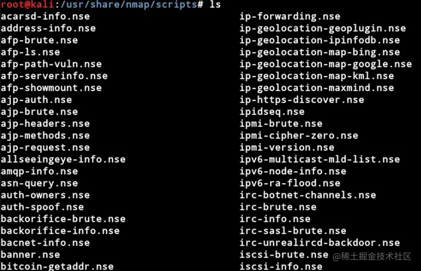 在使用nmap时,通过在命令中加--scritp就可以调用nmap的脚本来配合扫描。Nmap自带后已经安装了很多脚本,kali中的路径如下所示。Windows相应的目录在:D:\Program Files (x86)\Nmap\scripts