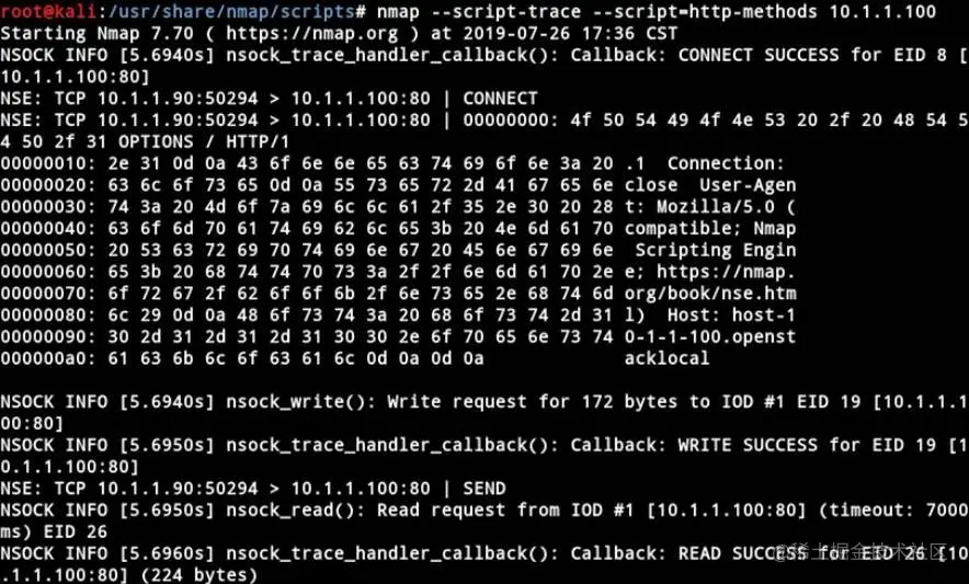nmap --packet-trace --script=http-methods 10.1.1.100