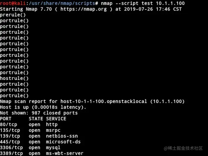 也就是说,prerule和postrule是在开始和结束运行,并且只运行一次,hostrule是扫描一个主机就运行一次,有N个主机就会运行N次,portrule是扫描到一个端口就运行一次,有N个端口就运行N次。