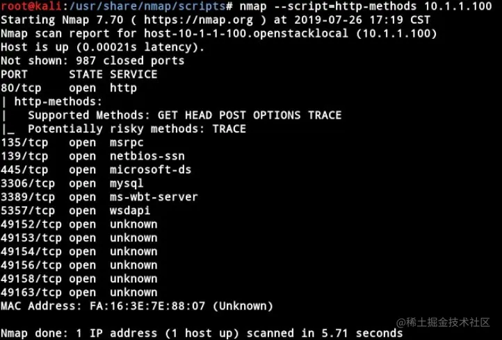 使用--script加载该脚本,在结果中会打印出支持的http方法 我们在脚本库中看到和http相关的脚本都是以http-的方式命名的,其他的也是一样,比如与ssh相关的都是以ssh-的方式命名。