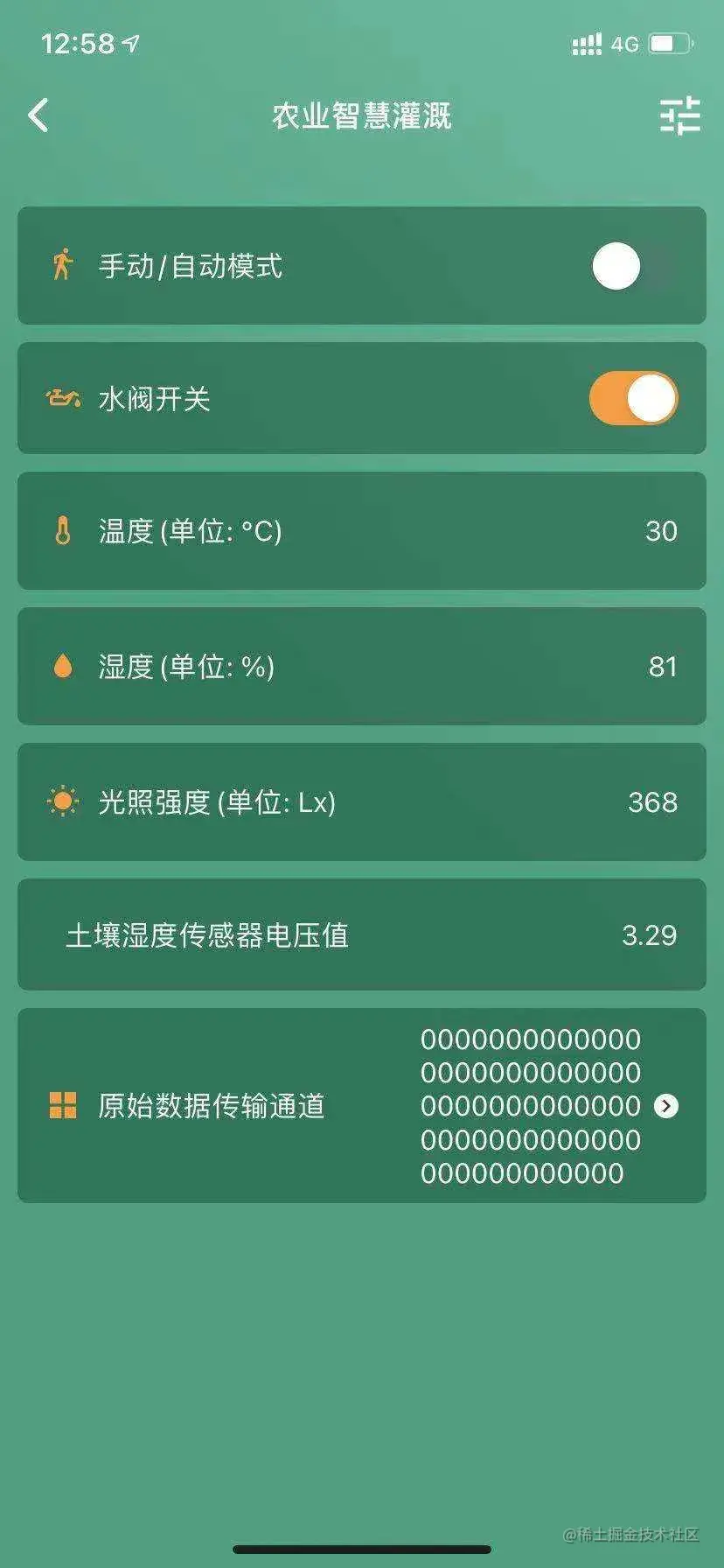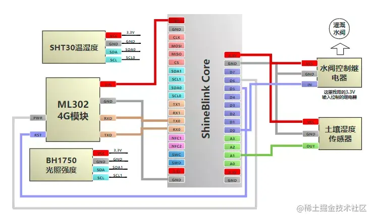 本文实现的智慧灌溉设备集成一些相关农作物关键指标的测量传感器(包含:光照强度、温度、湿度、土壤湿度),ShineBlink开发板板采集传感器数据,并将它们上传至机智云,然后我们就可以在远程通过手机App或者Web网页端来访问农作物的环境数据,并决定是远程人工控制打开灌溉水阀进行灌溉,还是让设备自动根据传感器的环境数据来进行灌溉。