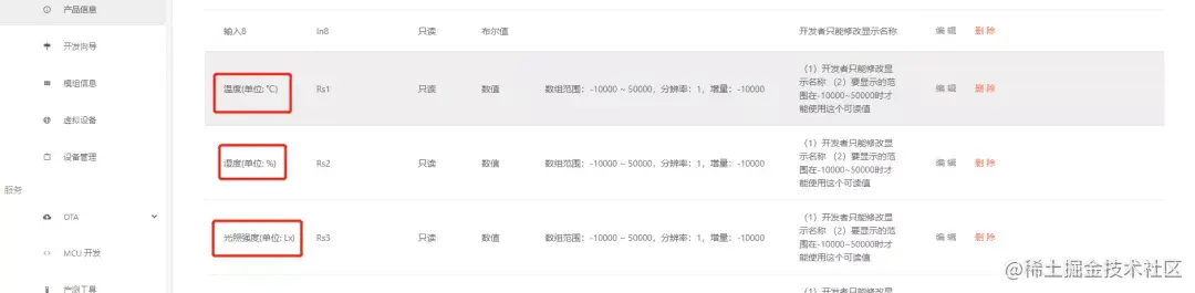本例中我们使用了"Rs1","Rs2","Rs3"这三个数据点分别作为温度,湿度,光照强度这三个传感器短整型值数据点作为上传至机智云的数据通道,记得在机智云平台修改相应的数据点的名称。