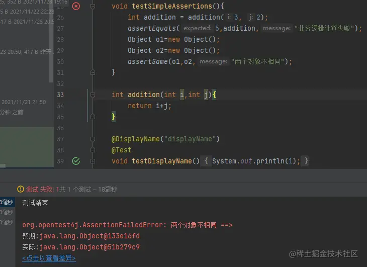 刚刚的这个函数有用来判断我们的返回的值是否相等,assertSame方法用来判断我们的对象是否相同
