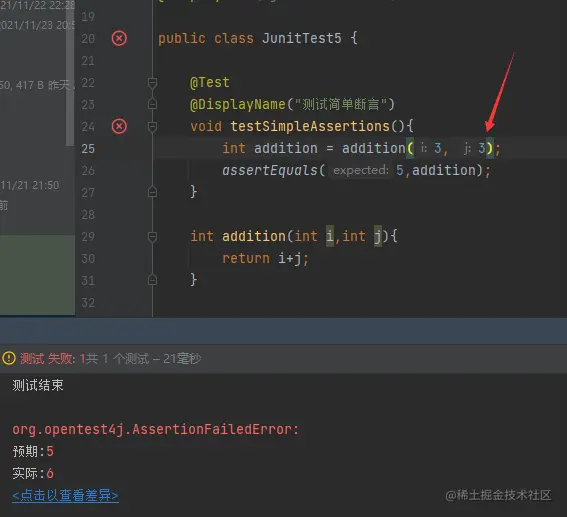 注意哦,我们修改了一个数,我们就可以看到我们的正确结果和我们的测试结果有哪里不同,我们也可以自定义我们的错误提示信息