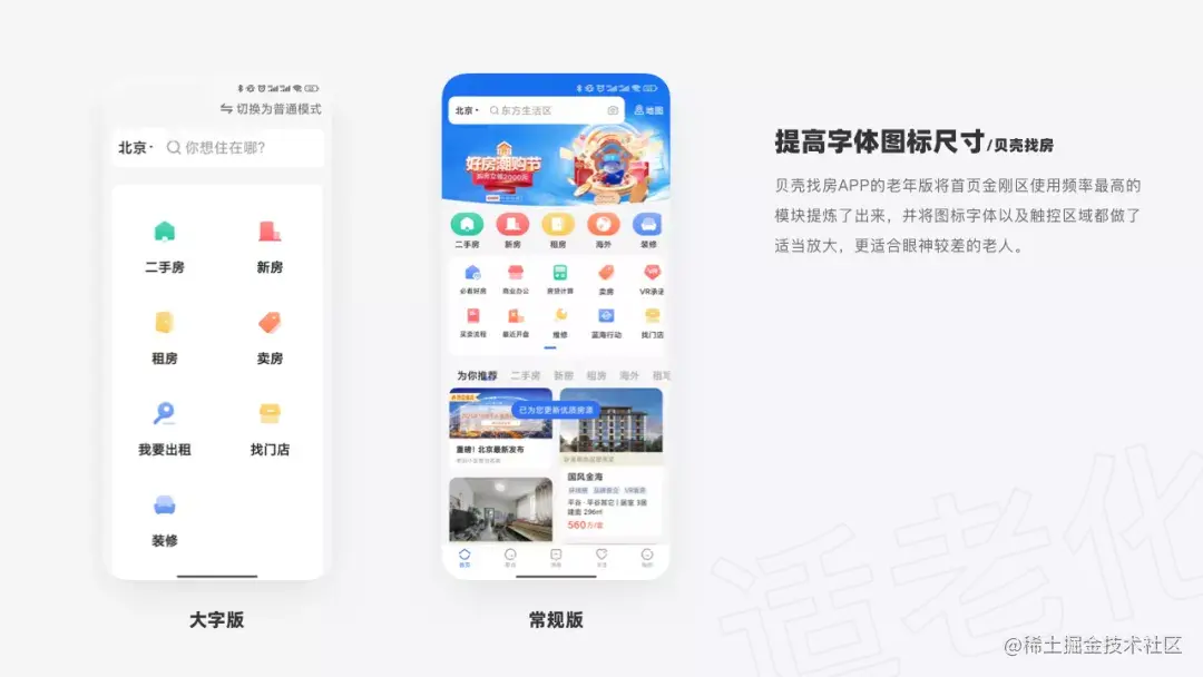 因此,在2020年,北京市通信管理局发布了《互联网应用适老化及无障碍改造专项行动方案》,这一政策的出台让很多学不会软件的老人重新燃起了希望的火种。但是现实却很残忍,企业们确实积极相应政府的号召开始着手于适老化的设计,但是最终的效果只能用差强人意来形容,很多公司为了偷懒,仅仅只把APP的字体放的老大,根本没有起到完全适老化的作用。