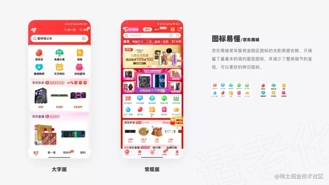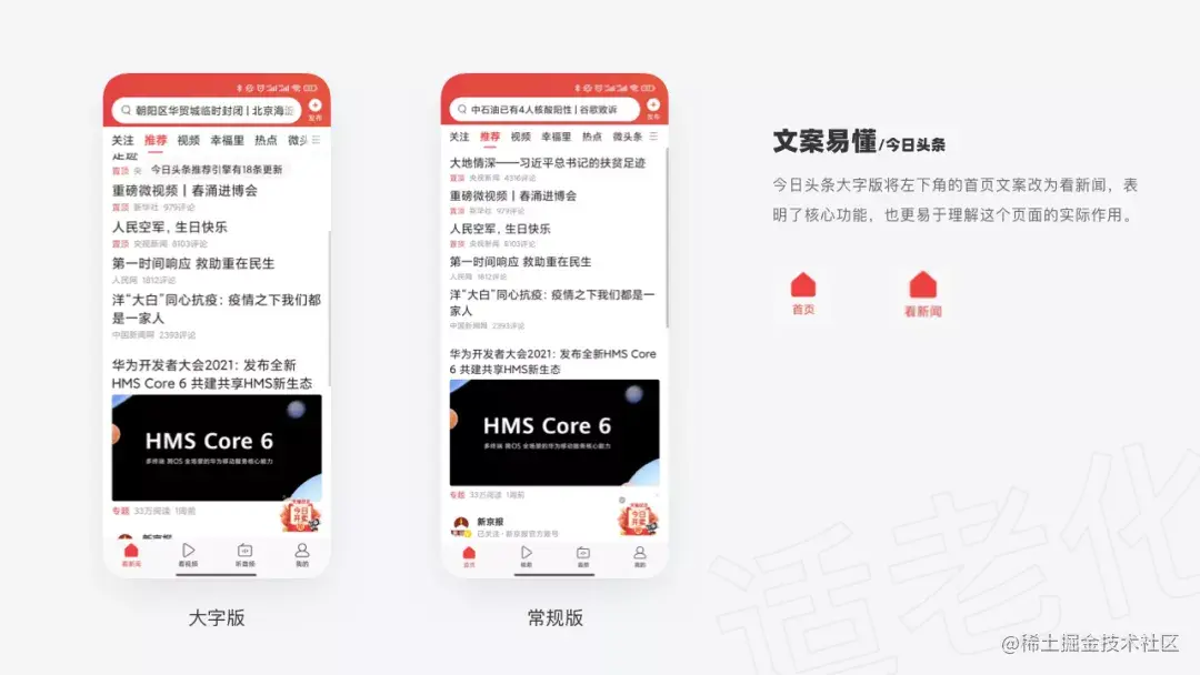 老人的视力与听力都会随着年龄的增大而退化,手机是多媒体产品,主要的功能就是看与听。所以我们的适老化设计就是要让老人可以在一块小屏幕上轻松的看到界面元素。
