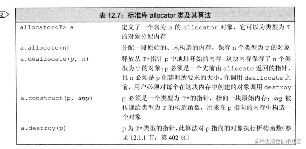 即使用的时候,用allocate分配空间,然后调用construct调用类的构造函数,最后结束后,先用destroy析构掉创建的对象,然后释放内存. (先析构,保证对象指针不会成为空悬)